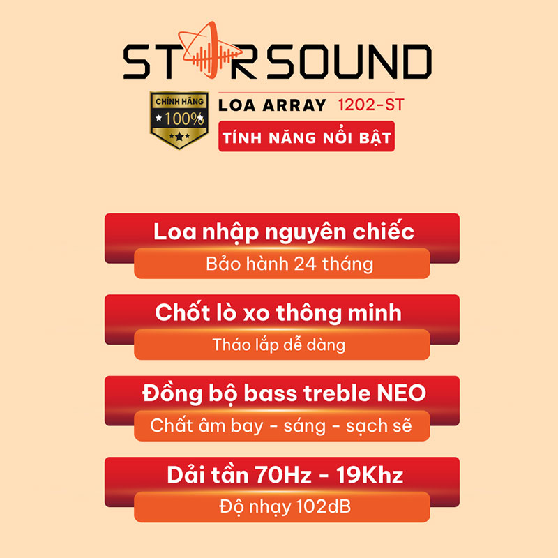 Loa Array Star Sound 1202-ST hoạt động trong dải tần số (-10dB) từ 85Hz đến 19kHz, đảm bảo tái hiện mọi dải tần của âm thanh trung thực, sống động và hay nhất, chơi tốt nhiều thể loại âm thanh. Ngoài ra với độ nhạy cực khủng lên tới 102dB giúp loa hoạt động hiệu quả với cường độ âm thanh lớn trong thời gian dài mà không bị méo tiếng, vỡ tiếng. Độ nhạy 102dB là độ nhạy lý tưởng ở những dòng loa cao cấp.